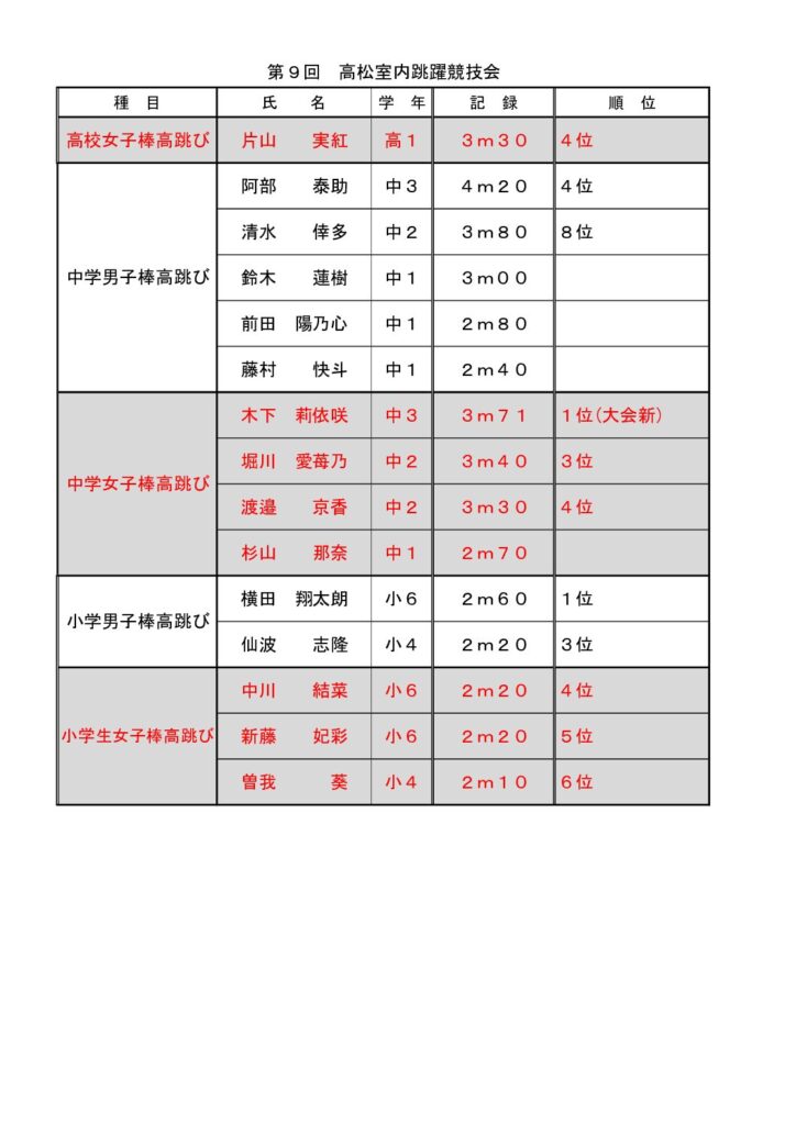 2月28日(土)、3月1日(日)の2日間、高松市屋島レグザムフィールドにおいて、「第9回高松室内跳躍競技会」が開催され、Glanz ACから15名の小中高校生が出場しました。この大会参加の目的は、前回の「香川室内大会」同様、冬季練習中の途中経過の確認(今やっていることが、試合の場面でどのぐらいできるか)及び今後の課題を持ち帰ることです。ベストが出た選手、ベストタイが出た選手、ベストには及ばなかった選手と結果は様々ですが、今回、記録はさほど重視していません。記録に一喜一憂することなく、シーズン開始への準備を進めてほしいと思います。